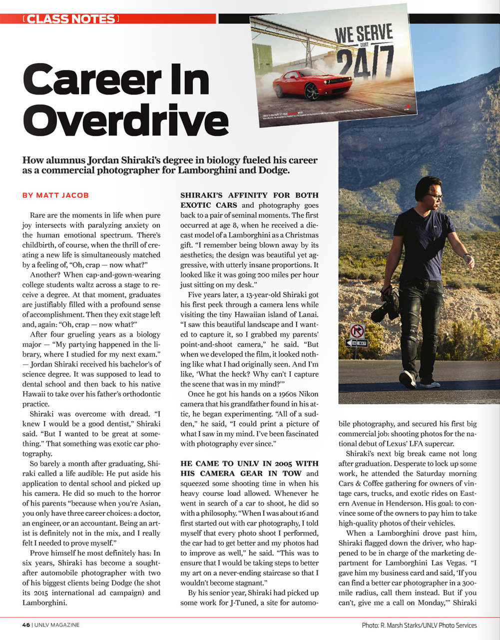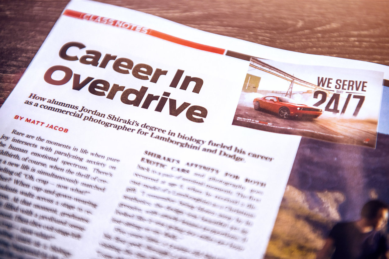 How alumnus Jordan Shiraki's degree in biology fueled his career as a commercial photographer for Lamborghini and Dodge.
